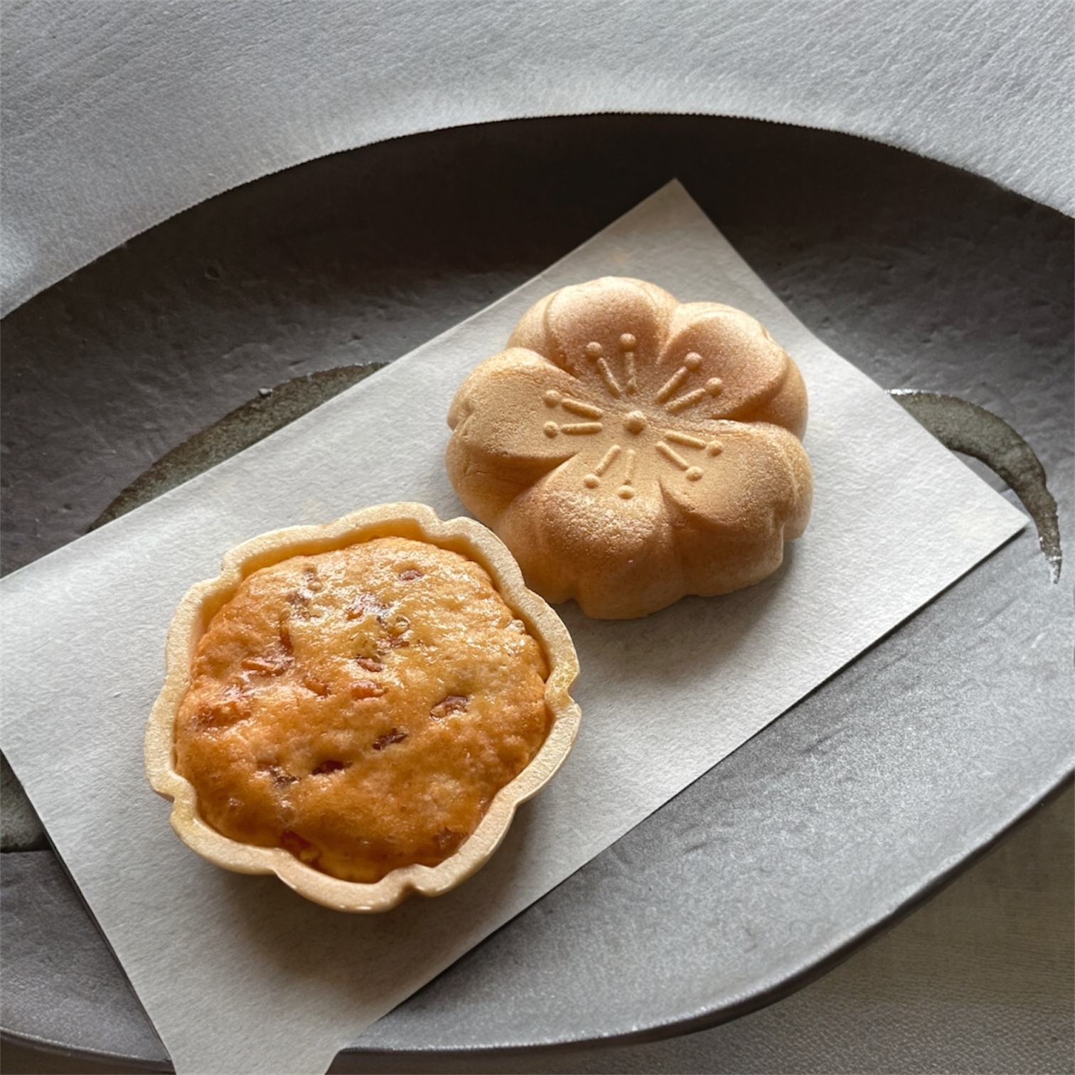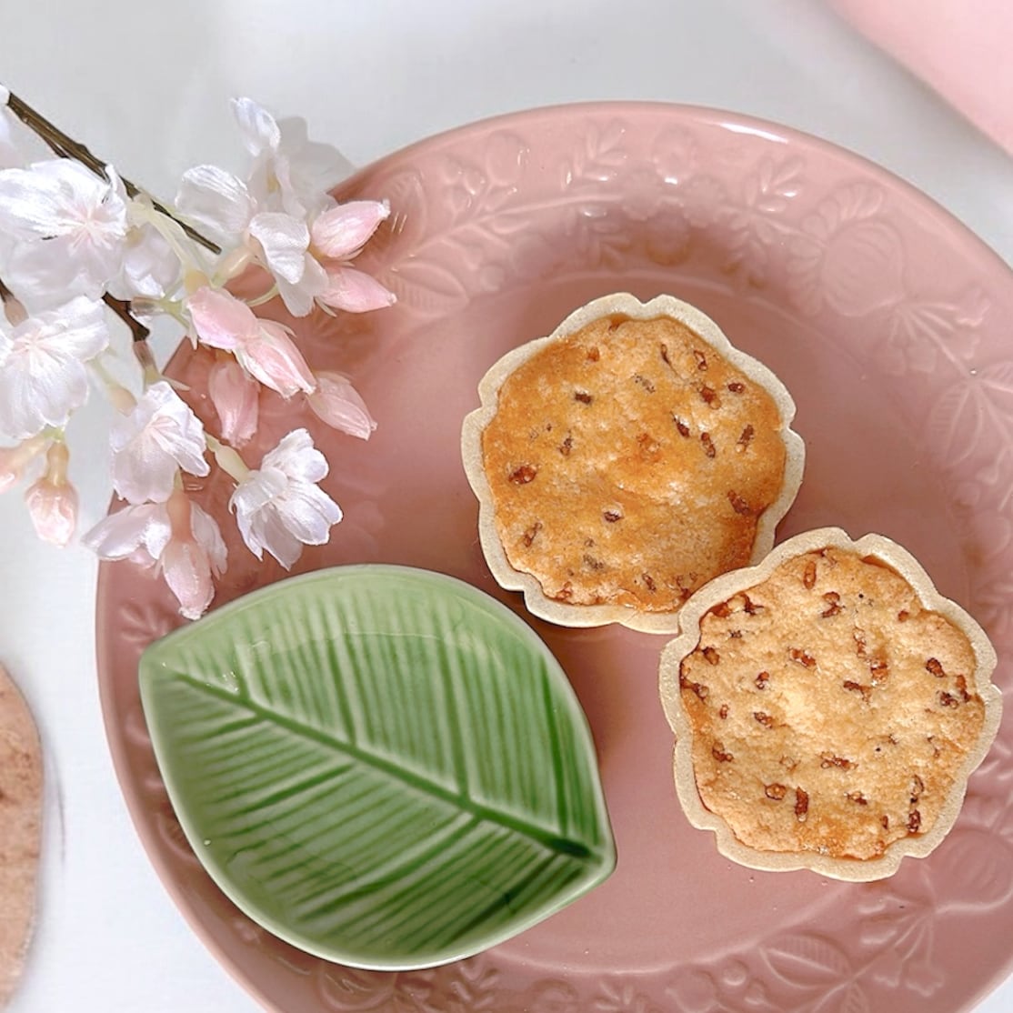さくらの花びらの器 (最中種)に山形県のブランド米「つや姫」を使 用した生地をのせ、サクサク食感の焼き菓子に仕上げました。